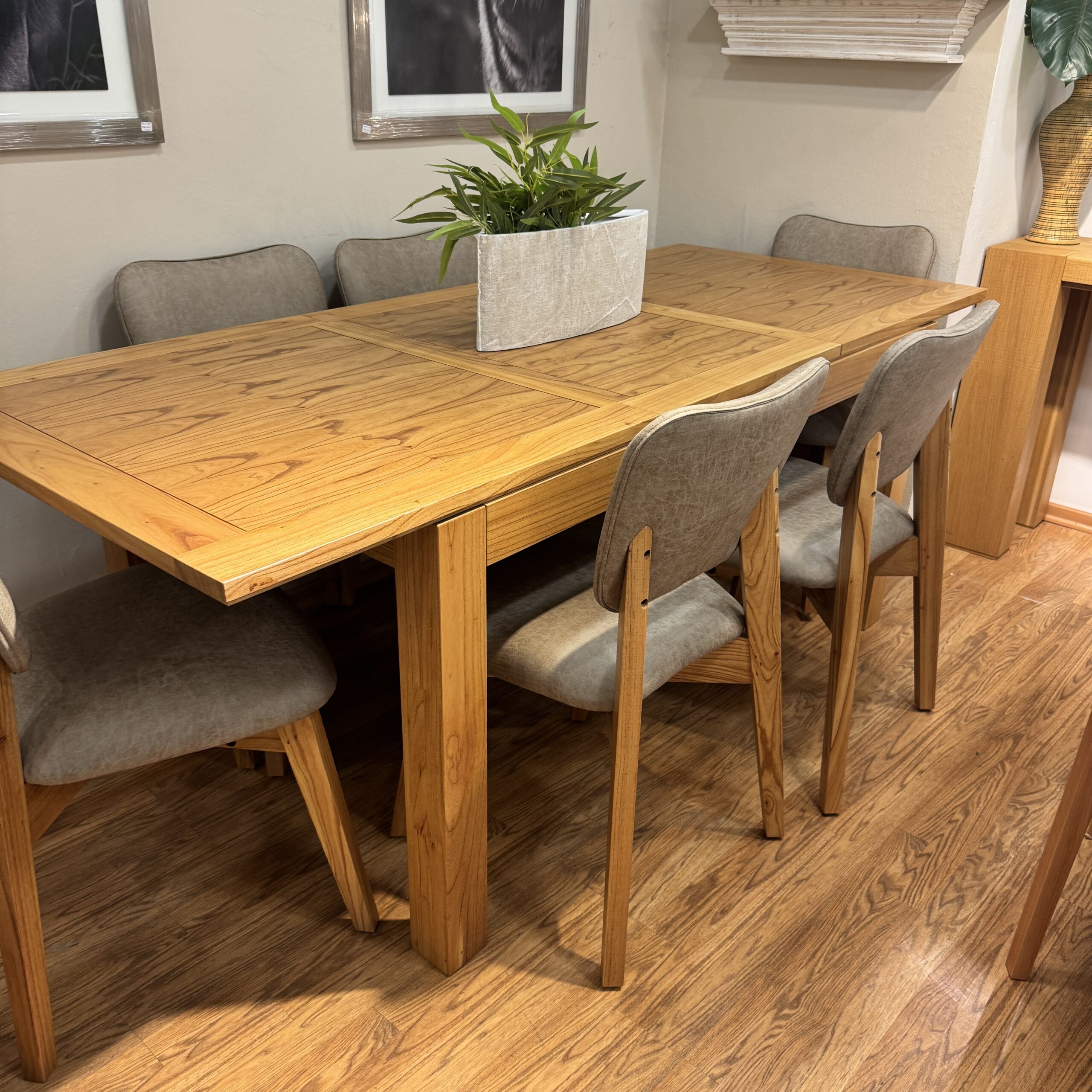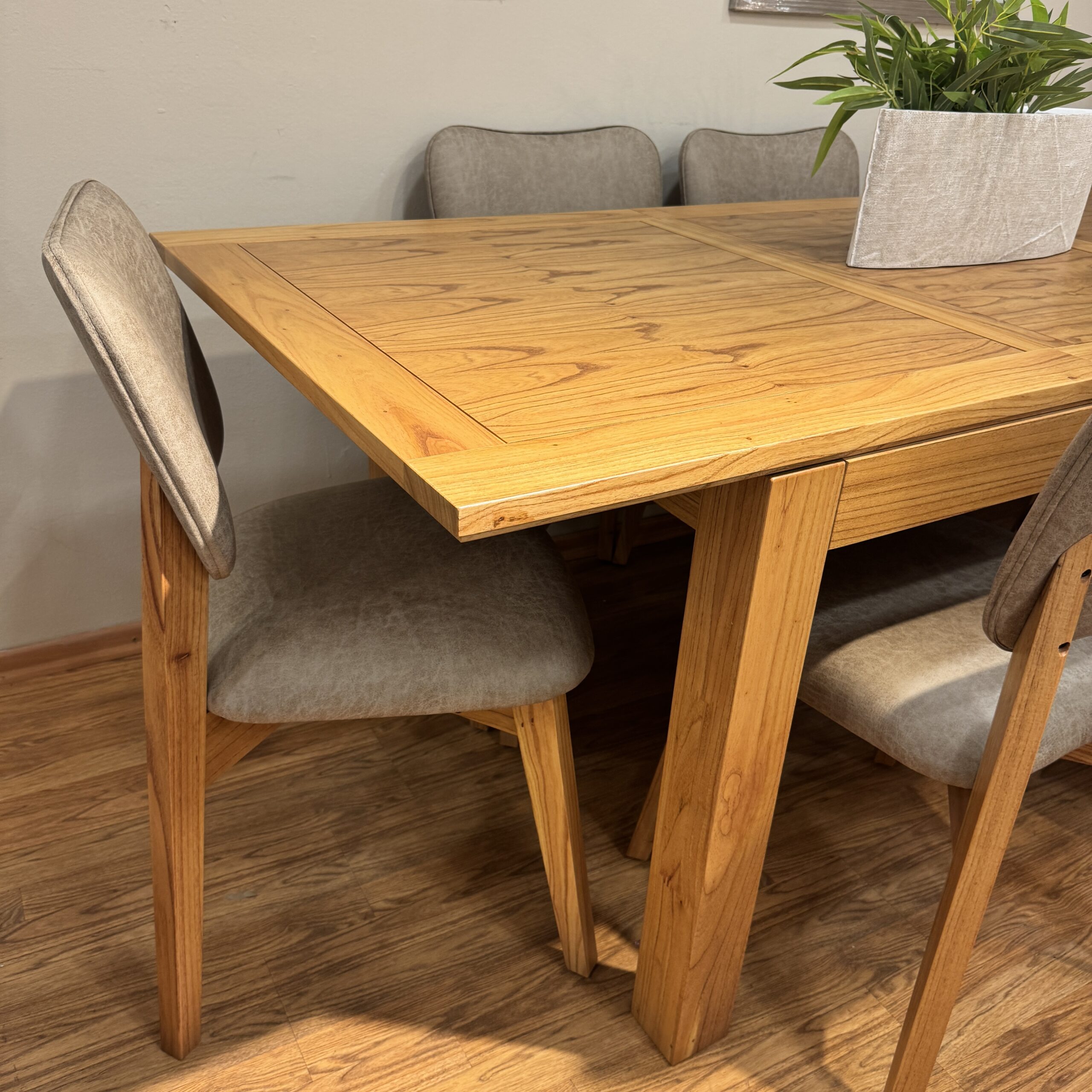 Juego comedor mesa 1,55×0,90mts extensible + trampa 0,60mts + 6 sillas madera cedrillo tapizado en tela a elección . Consultar financiación con tarjeta de crédito en cuotas.