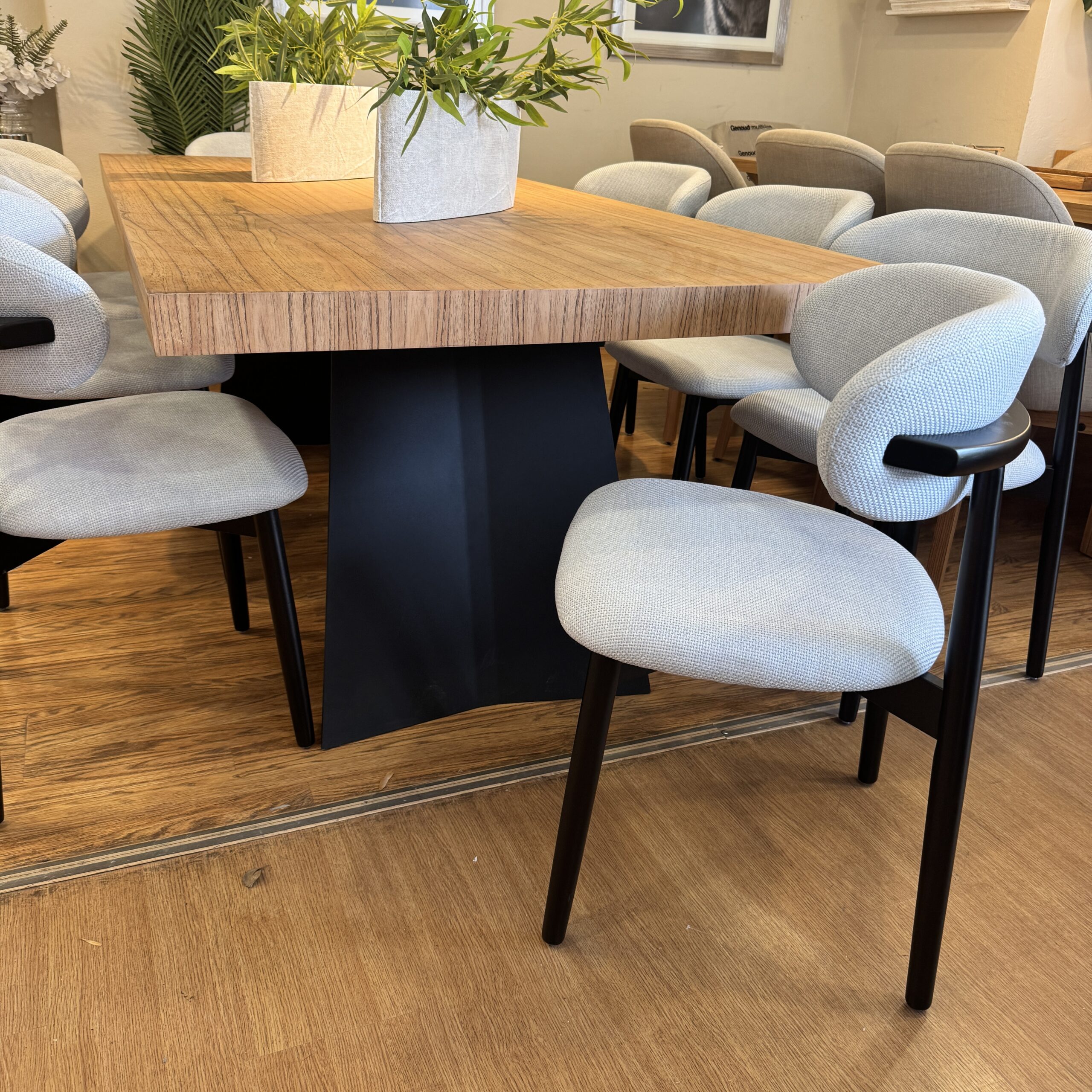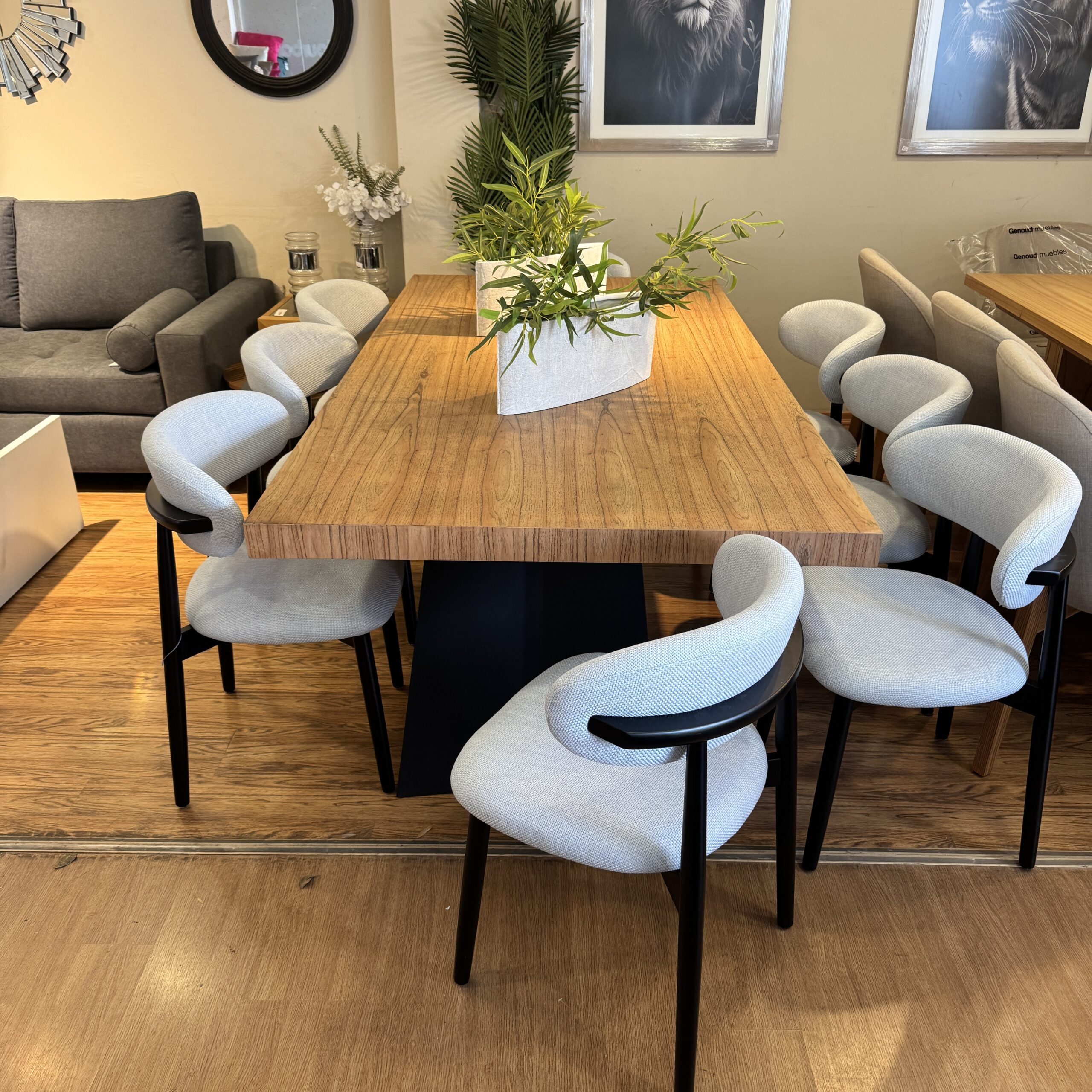 Juego comedor , mesa base negra con detalle cromado y tapa madera paraíso con textura medida 2,20×1,10mts + 8 sillas negras tapizado en pana anti mancha ídem foto.