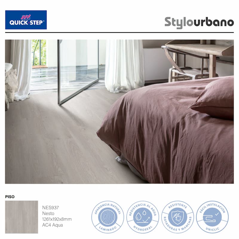 Piso flotante Aqua marca QuickStep línea Nesto origen Bélgica.