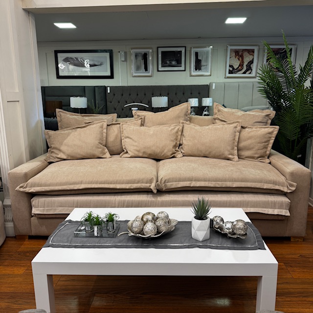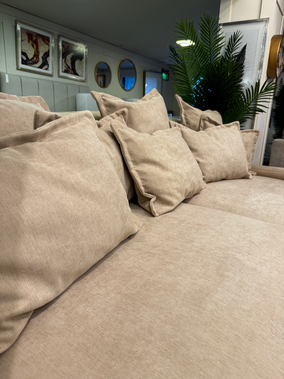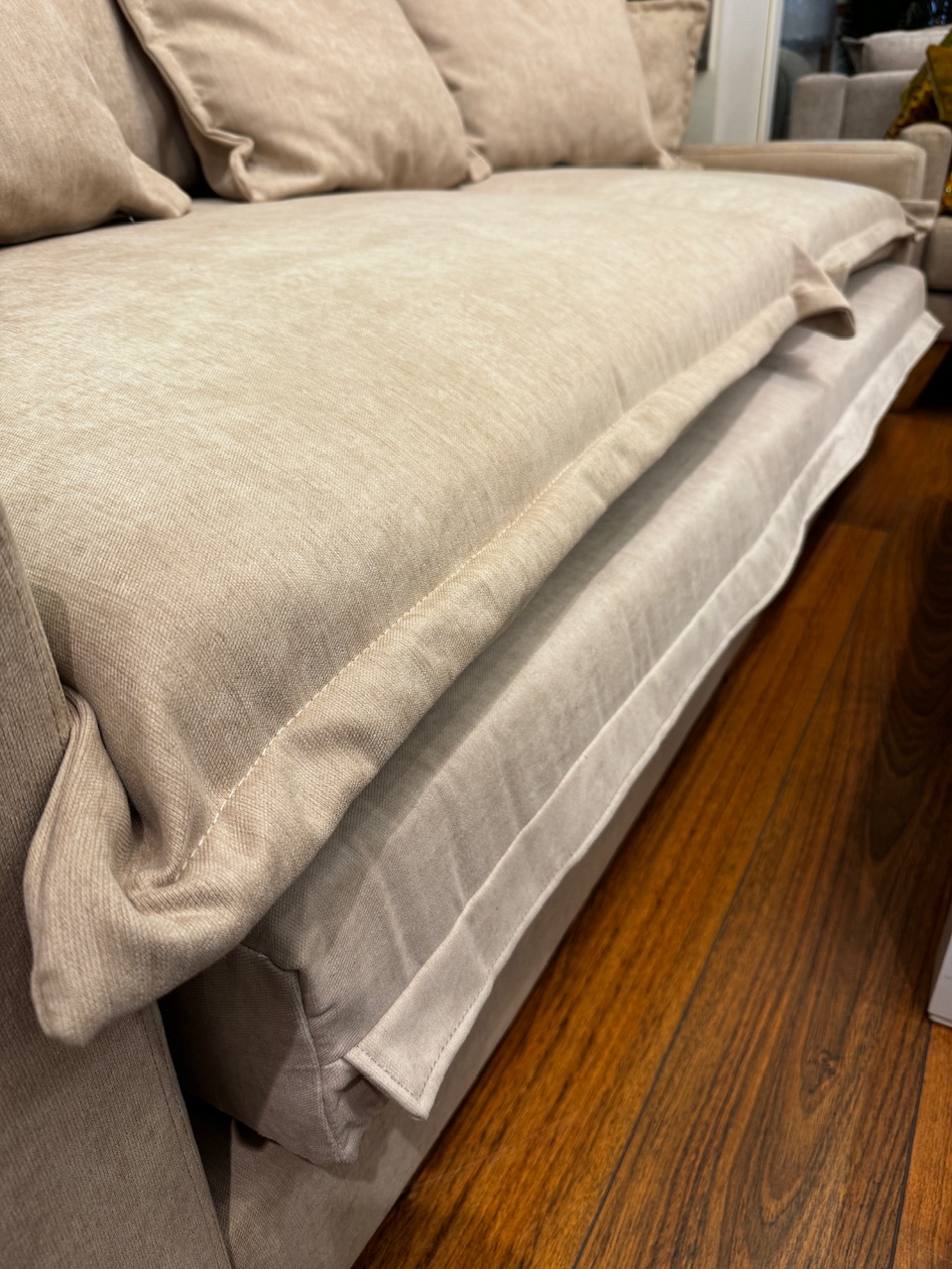 Estructura en 2 módulos, doble placa superior soft en asiento, almohadones traseros con vellón siliconado. Tapizado con pana anti mancha ídem foto. Costuras con ribete ancho. Incluye todos los almohadones traseros.